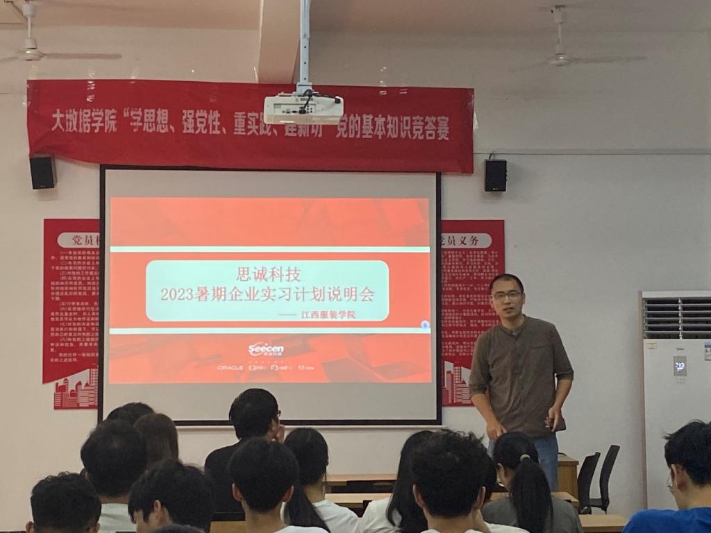 随后,思诚科技的企业老师针对2023年暑期实习计划进行了说明,首先说明本次实习活动为思诚科技面向合作院校项目,不收取任何费用;思诚科技为参加企业实习的同学提供免费住宿;思诚科技也会为参加企业实习的同学购买团队意外伤害保险等各种事宜,然后对江西思诚科技有限公司进行了介绍;最后,就实习的内容进行说明,本次实习内容为美团移动APP开发包括Maven项目管理、云打包技术、Vue框架开发技术等内容。