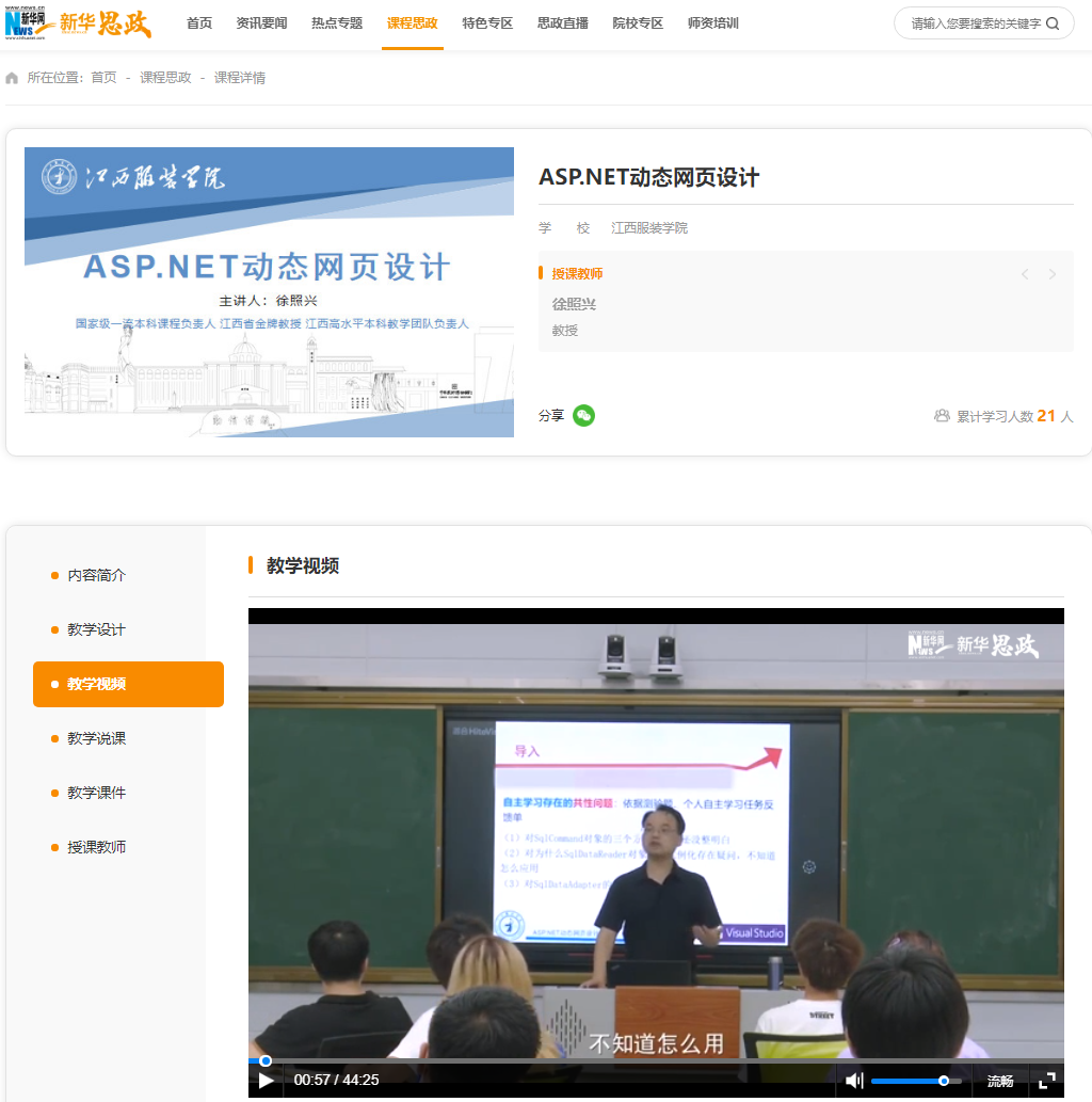 近日,由公司XC体育经理徐照兴教授主讲的《ASP.NET动态网页设计》课程在新华网“新华思政”——全国高校课程思政教学资源服务平台上线,面向全社会开放,共享教学设计、视频、说课、课件等教学资源,标志着公司在课程思政建设工作方面取得了新进展。