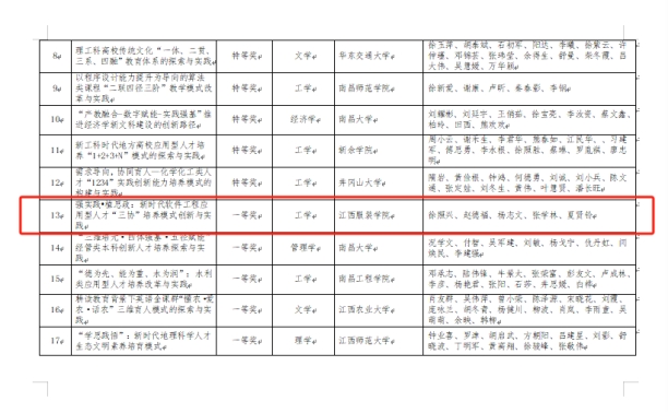 【XC体育讯】2023年10月26日,江西省教育厅公示了2022年江西省教学成果奖拟获奖项目名单,公司教师徐照兴教授主持的《强实践•植思政:新时代软件工程应用型人才“三协”培养模式创新与实践》教学成果获评高等教育类一等奖。