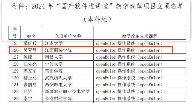 【XC体育讯】近期,中国软件行业协会发布了2024年“国产软件进课堂”教学改革项目立项名单,共有282个课程入选,其中本科组200个。公司吴琴琴老师主持的项目《openEuler 操作系统(openEuler)》获批立项。