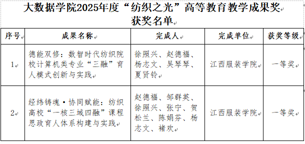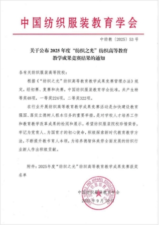 【XC体育讯】近日,中国纺织服装教育学会正式发布《关于公布2025年度“纺织之光”纺织高等公司产品成果竞赛结果的通知》(中纺教〔2025〕53号)。公司徐照兴教授主持的《德能双修:数智时代纺织院校计算机类专业“三融”育人模式创新与实践》、赵德福教授主持的《经纬铸魂・协同赋能:纺织高校“一核三域四融”课程思政育人体系构建与实践》两项成果,在全国众多参赛成果中脱颖而出,双双荣获2025年“纺织之光”高等公司产品成果奖一等奖。