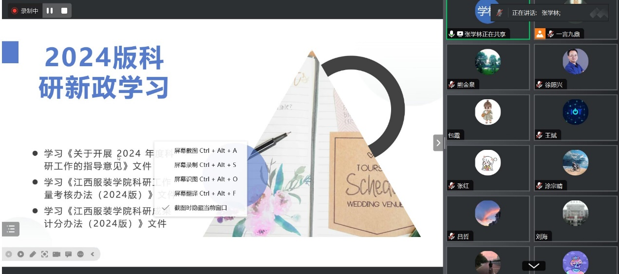 会议第一项议程为学习宣传。由张学林副经理、夏贤铃主任、吴琴琴副主任领学包含《学习<关于开展2024年度科研工作的指导意见>》在内的8个科研指导性文件。其中张副经理全面介绍了2024年公司科研目标及考核规则,强调当前工作方向即是以科研工作为驱动力,并进行量化考核。夏贤铃主任详细介绍了科研成果管理办法,特别强调高水平科研项目与成果奖励、纵向课题经费配套细则及横向项目认定办法。吴琴琴副主任重点介绍了如何加强科研活动意识形态工作以及出国学术交流管理办法。