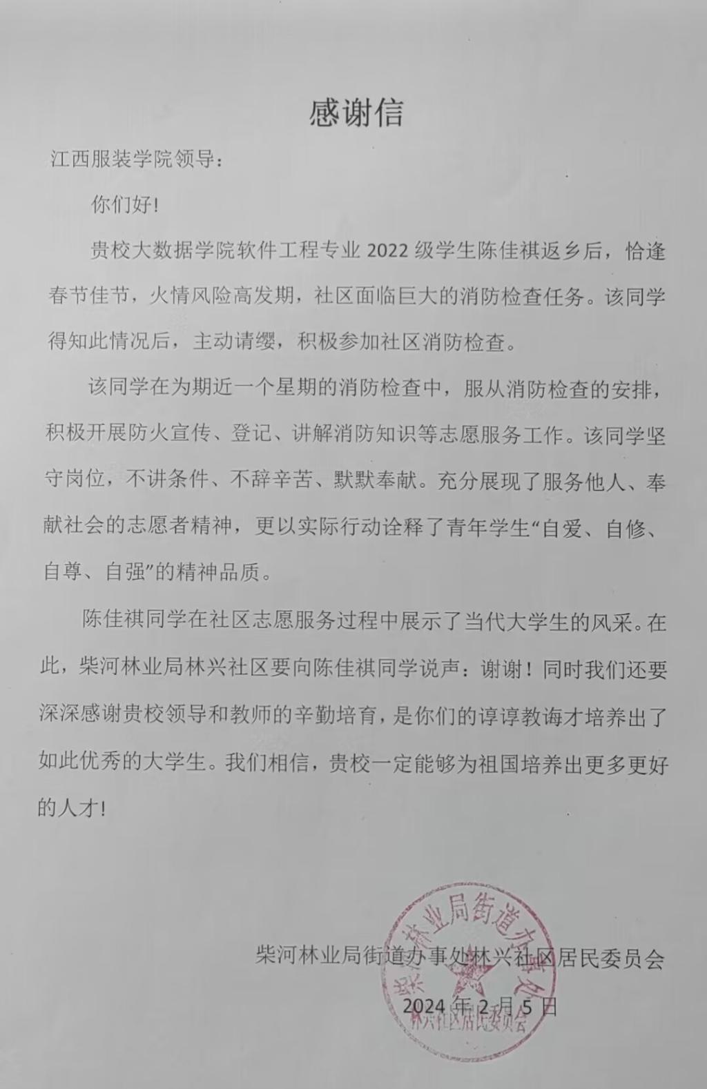 【XC体育讯】2024年1月29日到2月5日,新春佳节即将到来之际,因过年期间火情突发高危期。为全方位保障社区居民安全,陈佳祺同学参与柴河林业局林兴社区街道办事处进行消防排查活动。消除潜在隐患,增强消防安全意识。确保春节期间柴河社区各地的消防安全,营造平安和谐安全的节日氛围。