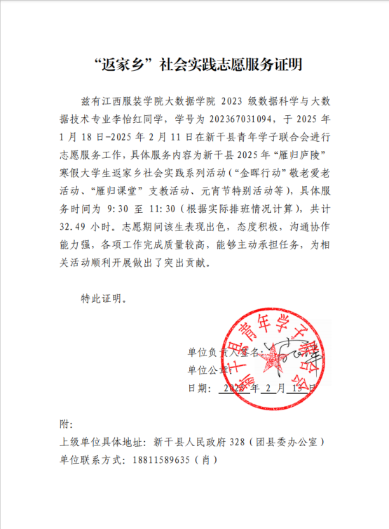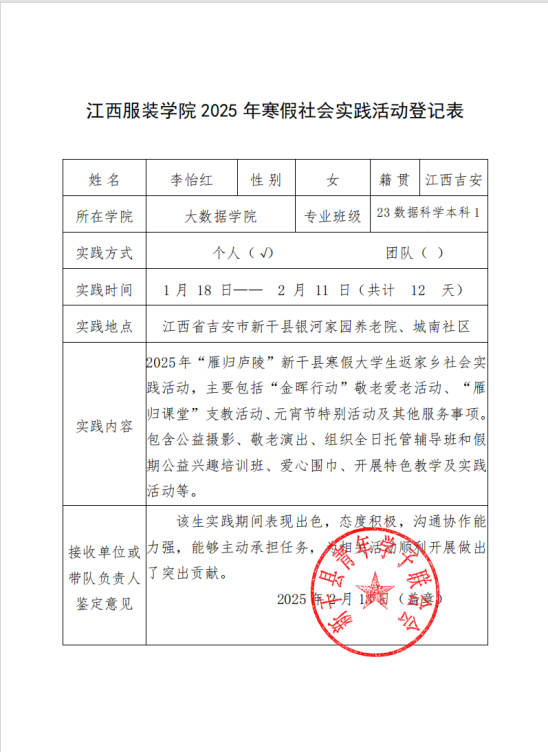 在这个寒假,李怡红同学迎来了一段特别的旅程,她参与了江西省吉安市新干县的“雁归庐陵”寒假老员工返家乡社会实践活动。这次经历,对她而言,不仅仅是时间的填充,更是心灵的触动与成长的见证。