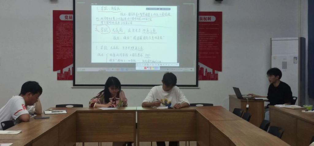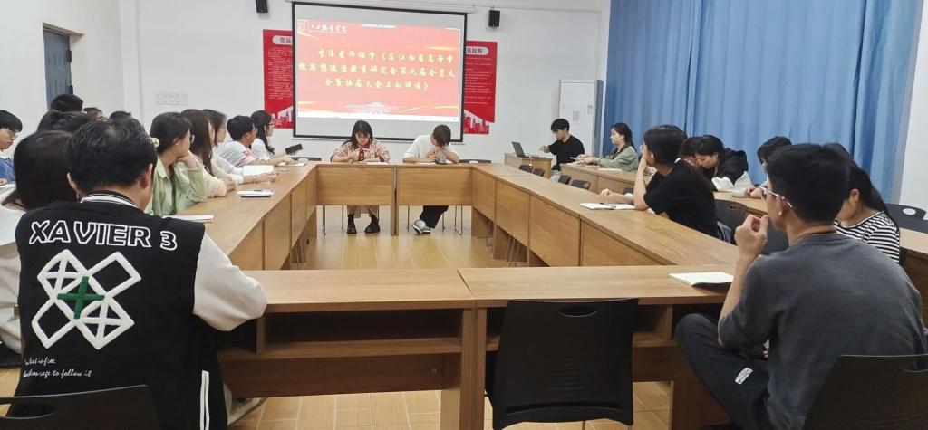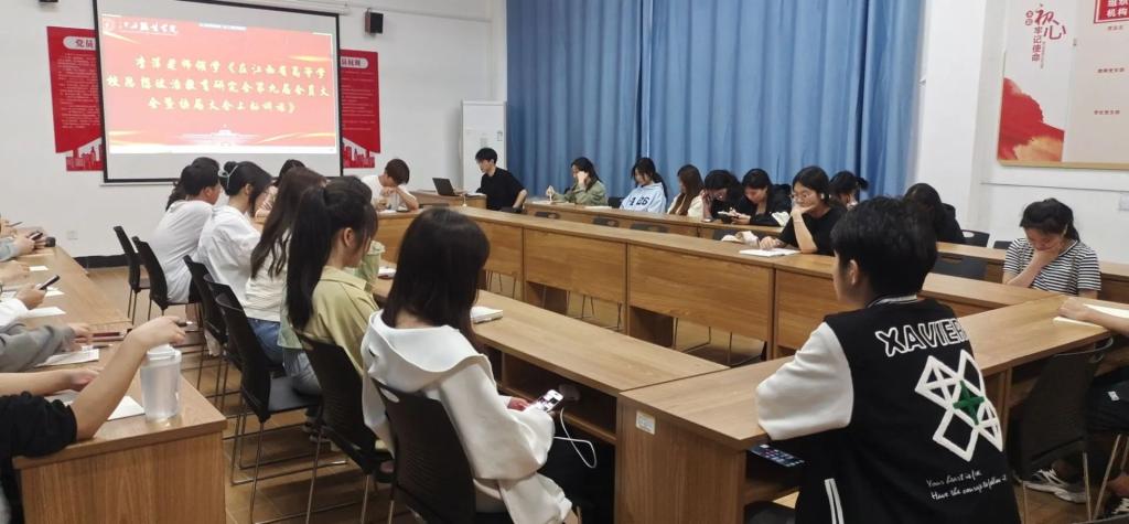 会议伊始,由分团委副书记李萍老师领学《在江西省高等公司思想政治教育研究会第九届会员大会暨换届大会上的讲话》,深入学习领会汪立夏重要讲话精神,学深悟透其关于高校思政工作的重要论述。