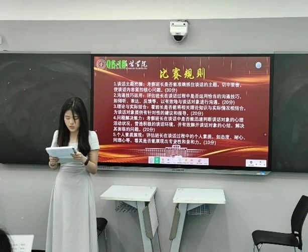 【XC体育讯】班长是班级管理中的核心力量,在班集体建设中发挥着组织管理、服务同学和引领示范带头作用,是班主任工作顺利进行的得力助手。为进一步发挥班长典型引领示范作用,切实加强班集体建设,提高班级员工素养。XC体育于2024年4月25日星期四在主教楼339开展了好班长争霸赛淘汰赛,本次比赛特邀学工办副主任周文琴、倪若荑等辅导员担任本次评委。