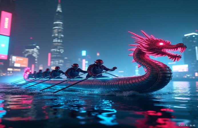作品亮点:以“赛博朋克”风格重新诠释龙舟,金属质感外壳、霓虹灯带和机械龙头设计充满未来科技感,展现了传统习俗的创新表达。
