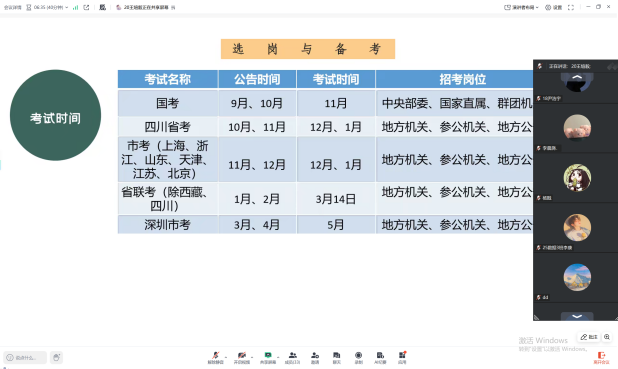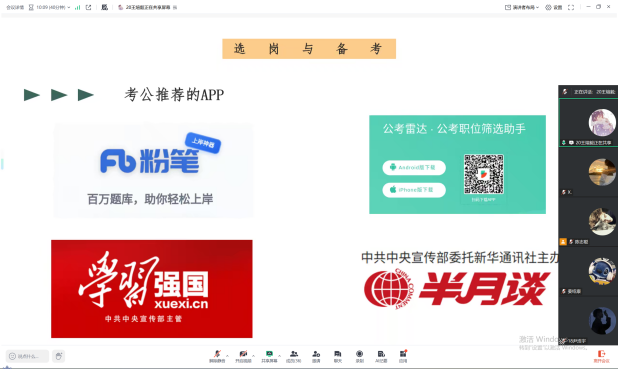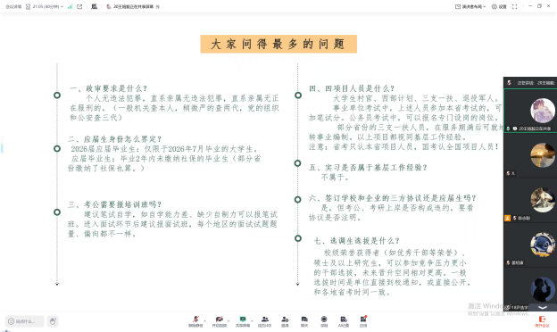 【XC体育讯】为精准响应员工就业需求,2025年11月21日晚19:00,XC体育“就业服务系列推进会——考公经验分享会”在线上平台举行。本次会议专门邀请了20级的王煊毅同学来给学弟学妹们传授宝贵考公经验与个人独有心得。公司很多非毕业班的同学也加入会议室,大家共同解锁考公备考、选岗的实用“密码”。线上分享会由就业联络员陈志聪老师主持。