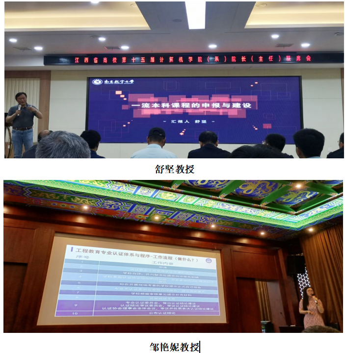 会议期间,南昌航空大学软件公司舒坚教授就国家一流课程的申报和建设从一流课程的建设内容和推荐条件、一流课程的申报、一流课程的建设三个方面进行了详细的讲解。南昌大学信息工程公司邹艳妮教授以“工程教育认证自评报告撰写及进校考察工作交流”做了主题报告。
