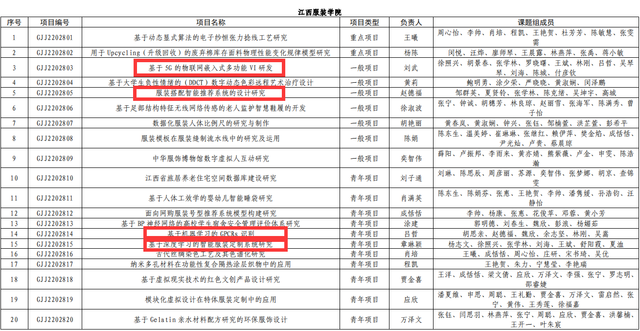 【XC体育讯】近日,江西省教育厅发布《关于公布2022年度江西省教育厅科学技术研究项目立项名单的通知》(赣教研字﹝2023﹞2号)文件,公司赵德福副经理主持申报的《服装搭配智能推荐系统的设计研究》、刘武教师主持申报的《基于5G的物联网嵌入式多功能VI研发》、吕哲教师主持申报的《基于机器学习的GPCRs识别》、章琳颖教师主持申报的《基于深度学习的智能服装定制系统研究》等4项获批立项,立项数创历史新高。